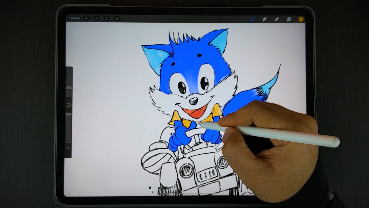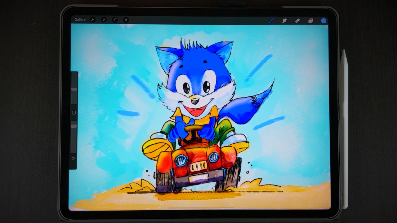 Digital illustration of a blue fox riding a mini cart using the iPad Pro and Procreate.